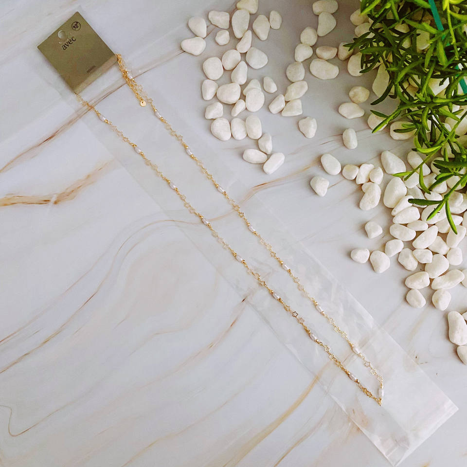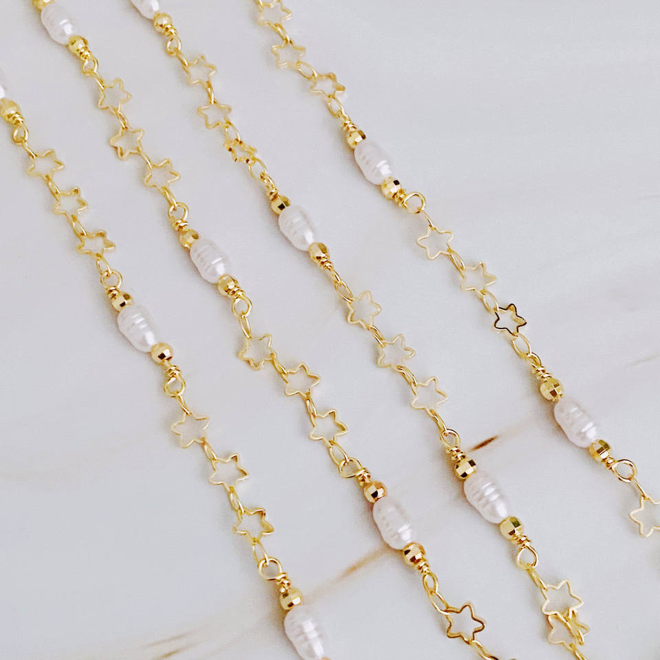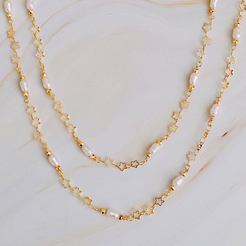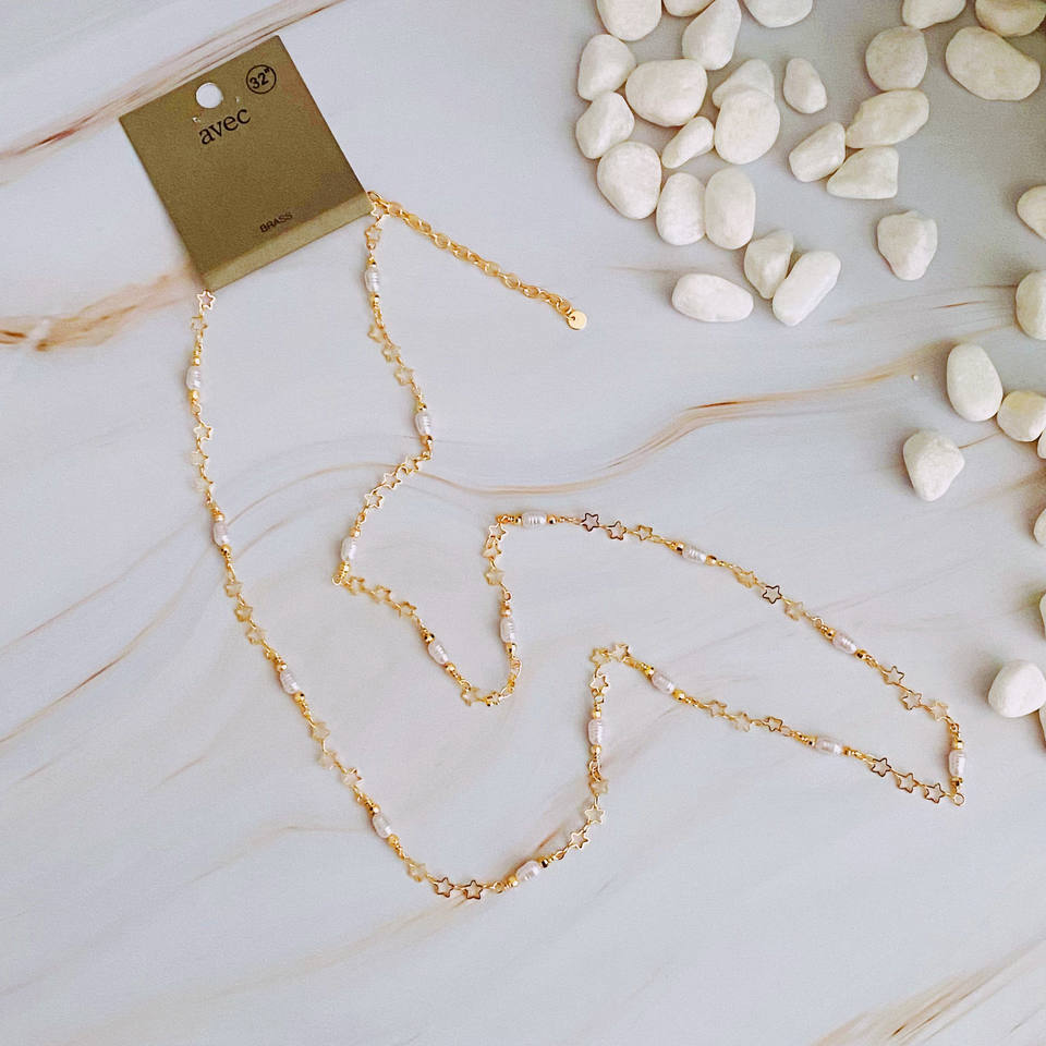 Collar de Cadena Larga con Mini Perlas y Mini Estrellas
