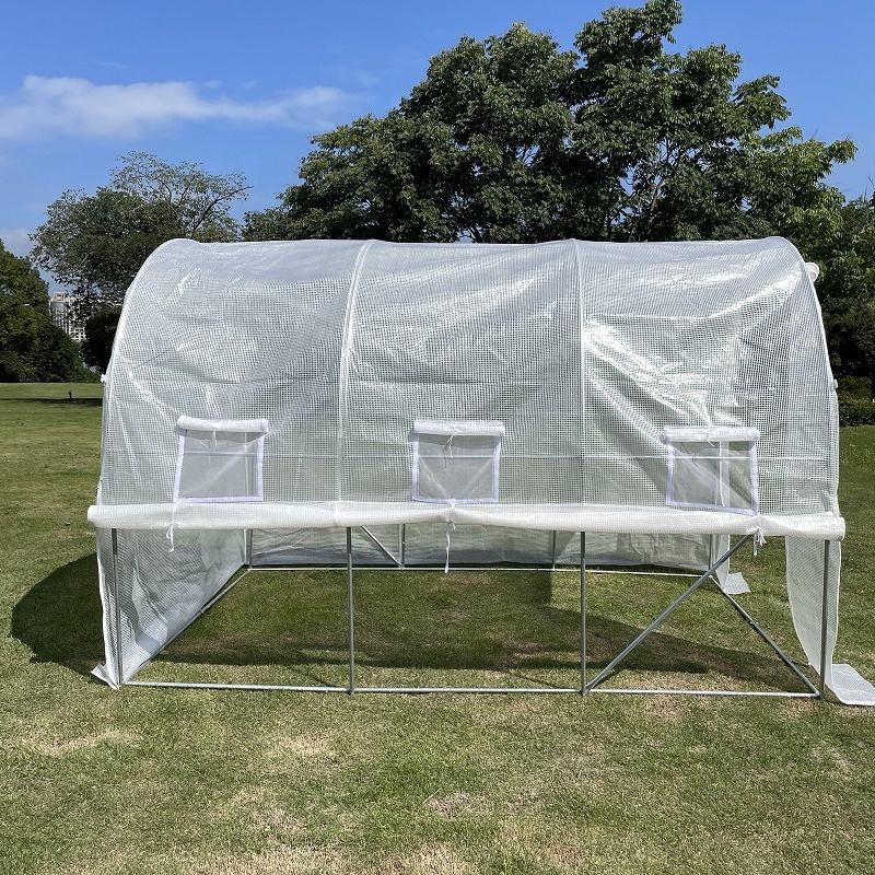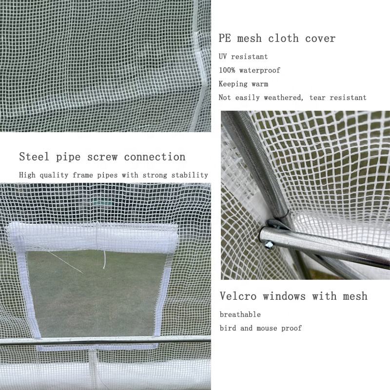 Cubierta:Tela de malla de PE blanca 140g/m2, 6 ventanas, 1 puerta enrollable con cremallera