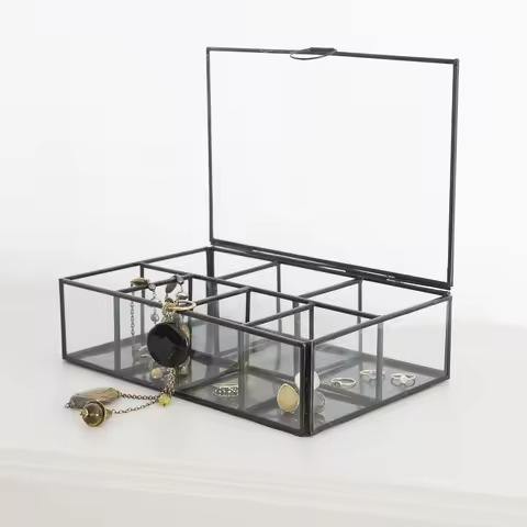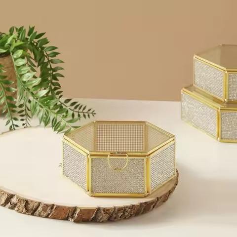 Mini Caja de Almacenamiento Rectangular de Cristal, Organizador de Joyas de Lujo de Metal Dorado, Caja de Cristal para Accesorios