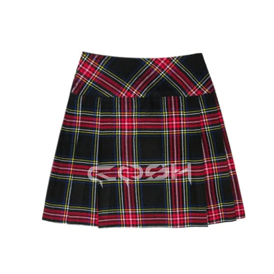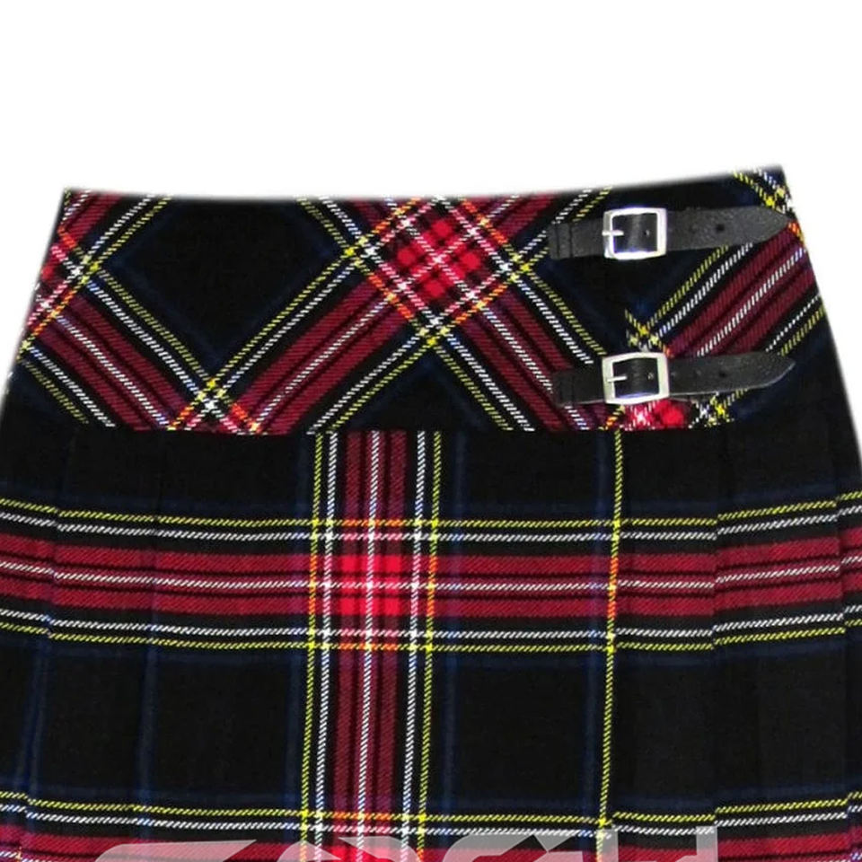 Mini escocesa para damas escocesas negro Stewart Tartan Kilt con correas de cuero único diseño a cuadros de moda proveedor y fabricante