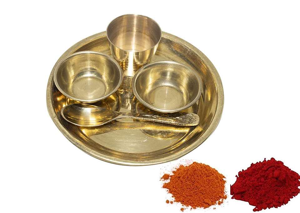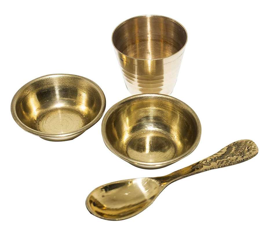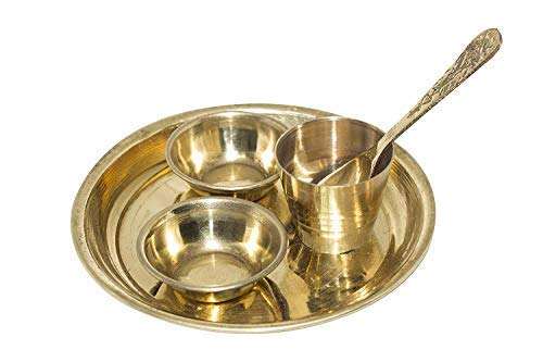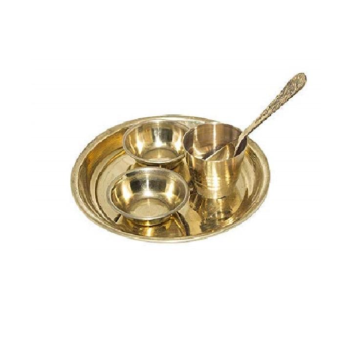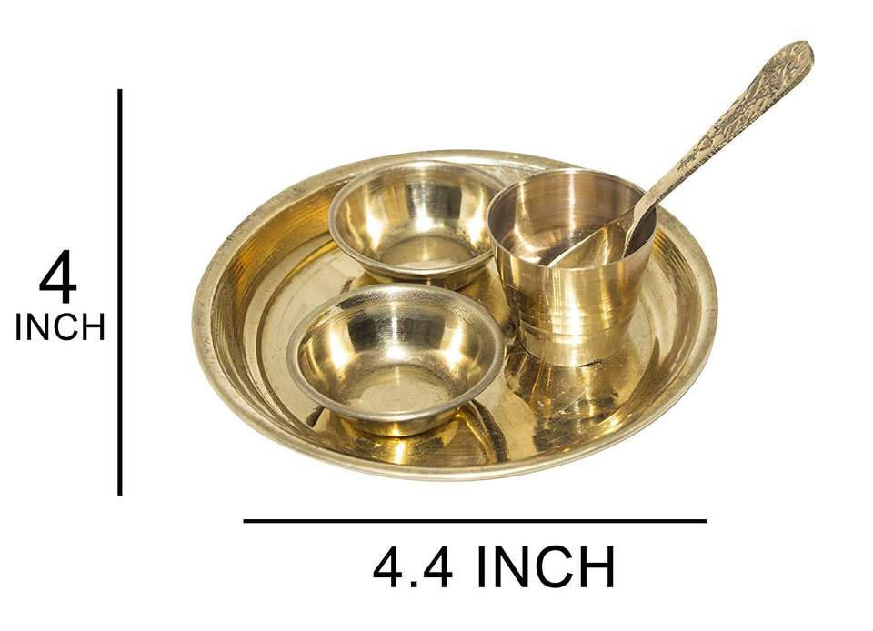 Mini set de thali de latón para pooja, platos pequeños, cuencos, cuchara, kalash, kit ritual compacto, para culto en templo, tamaño de viaje, decoración tradicional