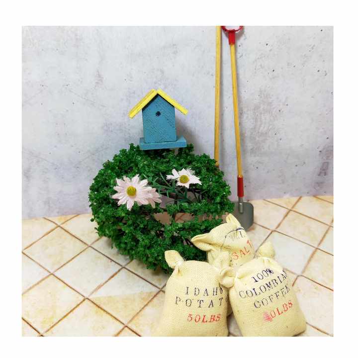 Nombre del producto:Casa de muñecas en miniatura Saco de patata, granos de café, sal y casa de pájaros