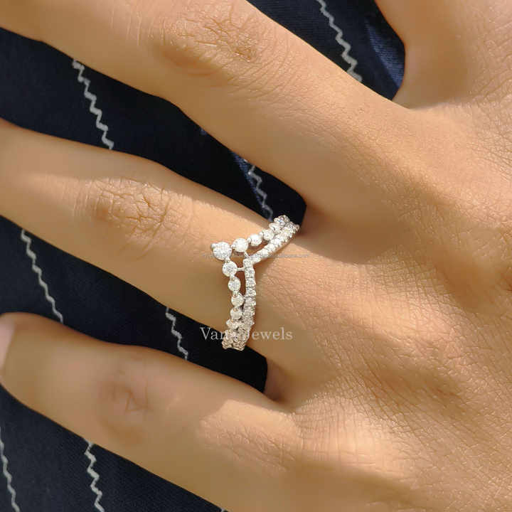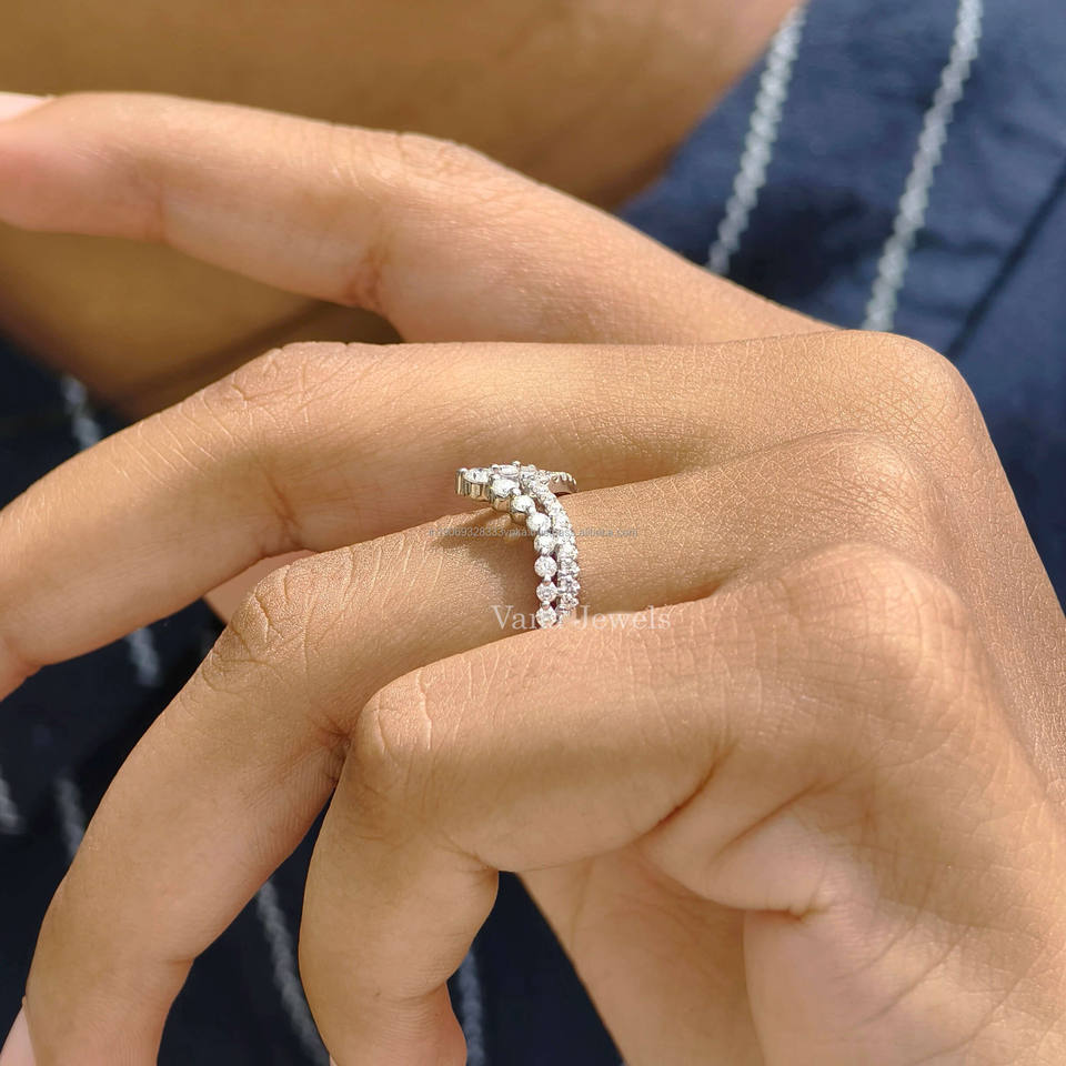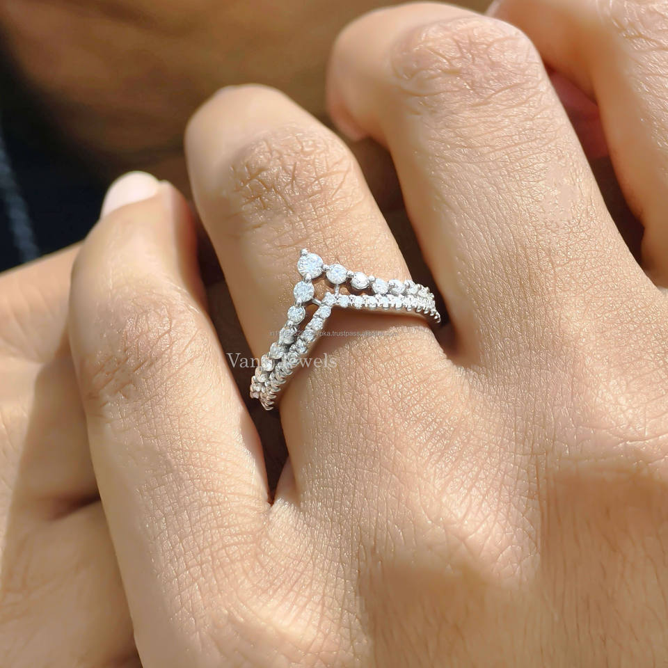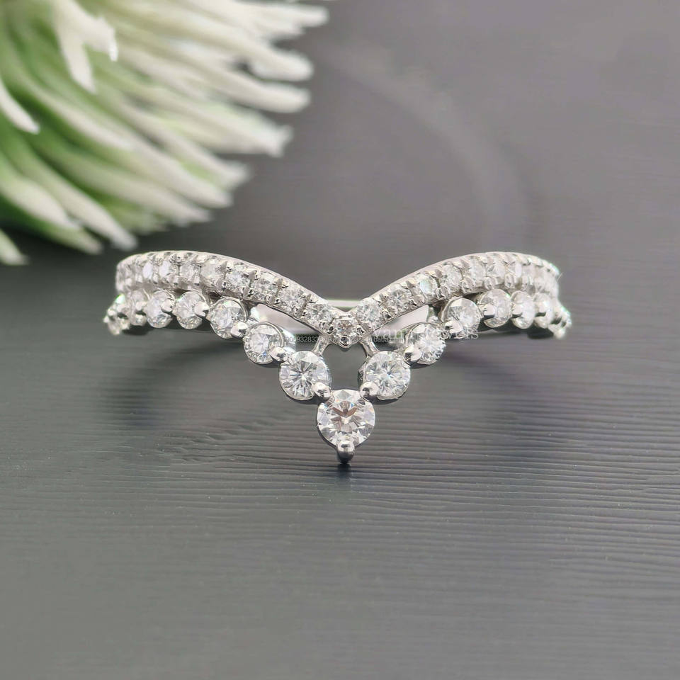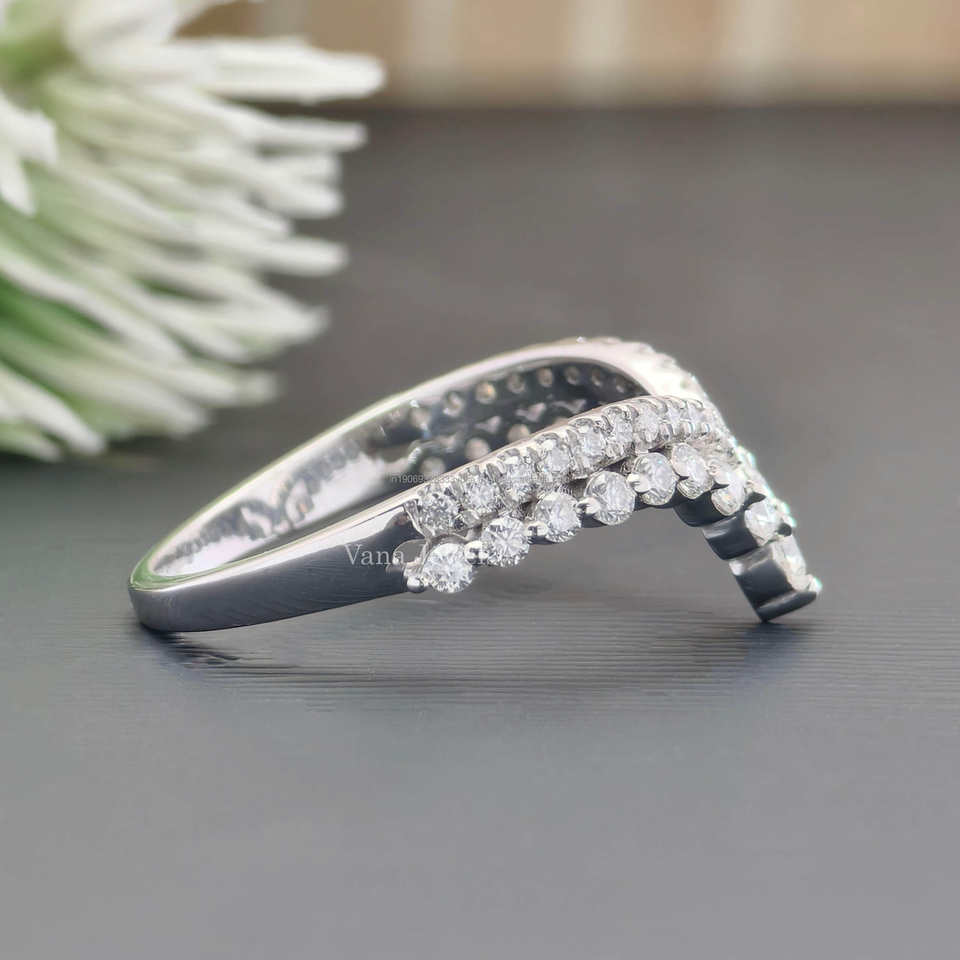 Minimalista 0,70 TCW corte redondo Moissanite Tiara boda banda en 18K oro blanco sólido con dos filas en forma de V estilo Curvo