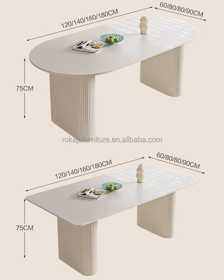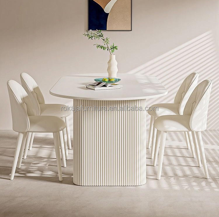 Mesa de Comedor de Diseño Minimalista con Acabado Lacado, Cubierta de Piedra Sinterizada Blanca, Mesa de Comedor Moderna Ovalada para 4, 6 u 8 Personas