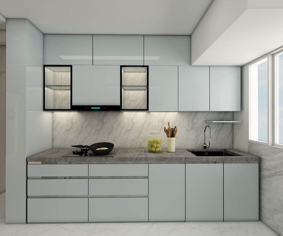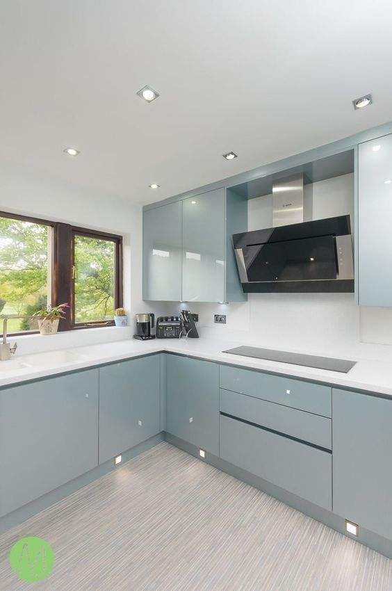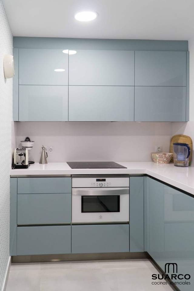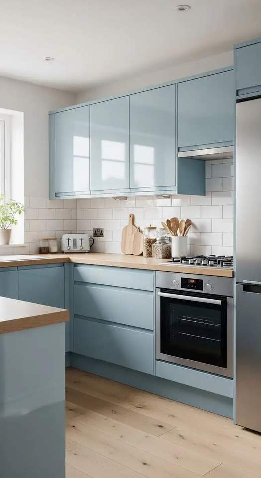 Gabinetes de Cocina Modulares de Madera Azul Claro con Acabado Brillante, Diseño Minimalista Personalizado, Fácil Instalación y Limpieza para Viviendas
