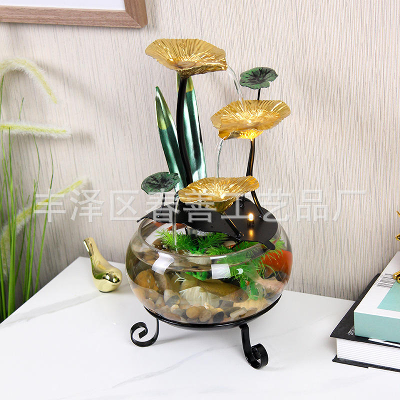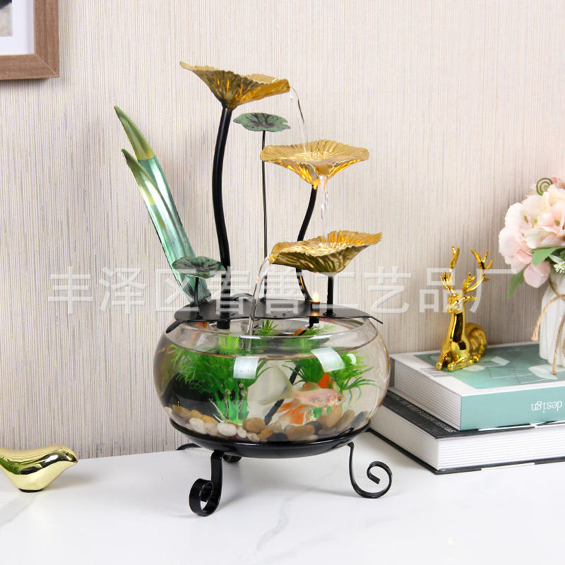 Acuario Redondo Minimalista de Cristal con Diseño de Loto Dorado para Decoración de Sala de Estar u Oficina