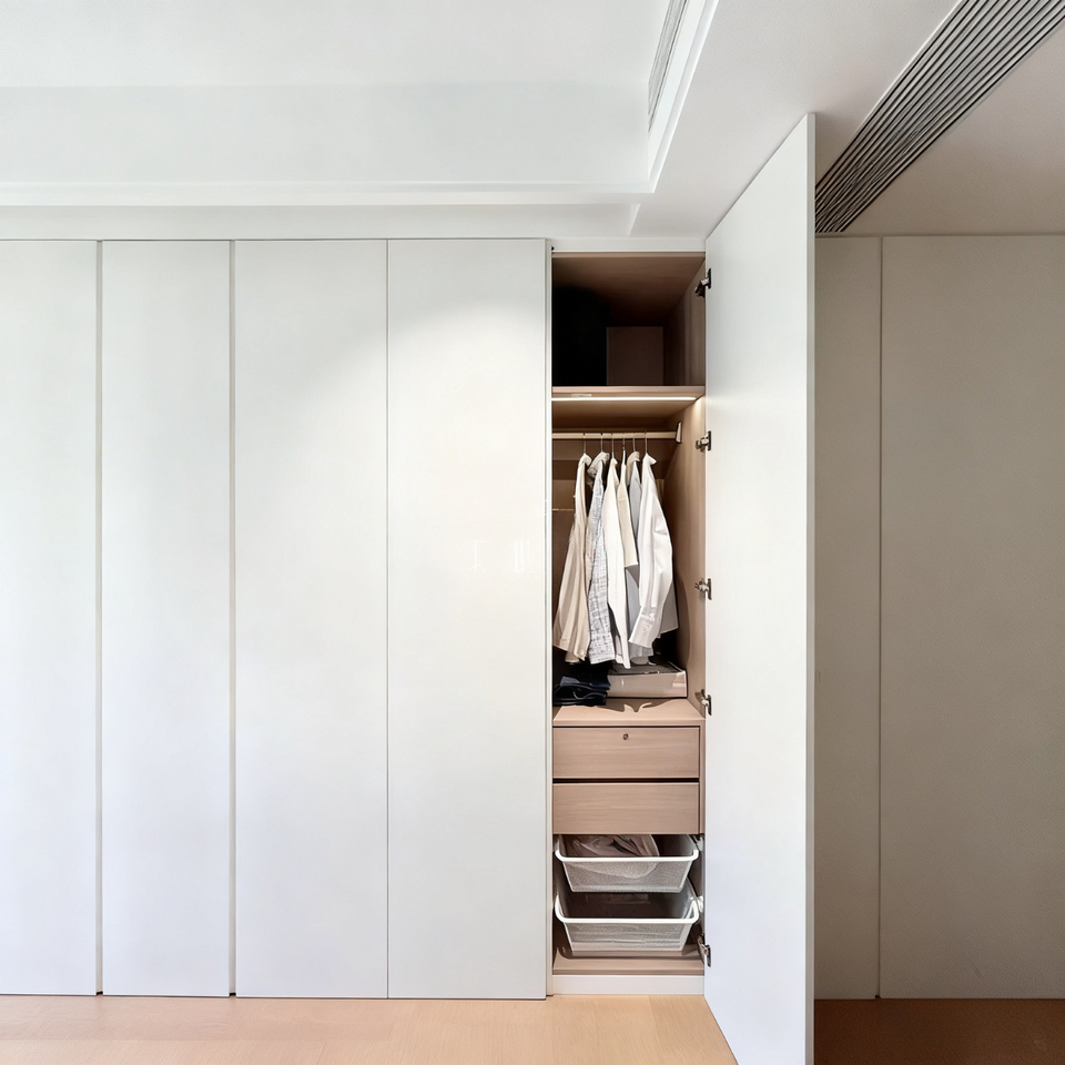 Armario Empotrado Minimalista con Puerta Invisible, de Piso a Techo, con Área de Colgado y Almacenamiento en Cajones