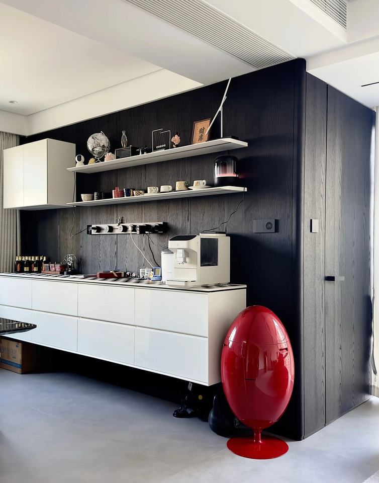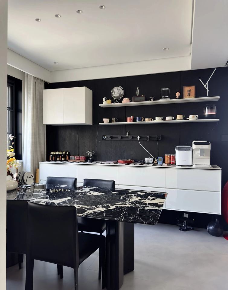 Aparador de Estilo Minimalista con Armarios Colgantes, Estación de Café Integrada, Vitrina Abierta con Estantes Ajustables