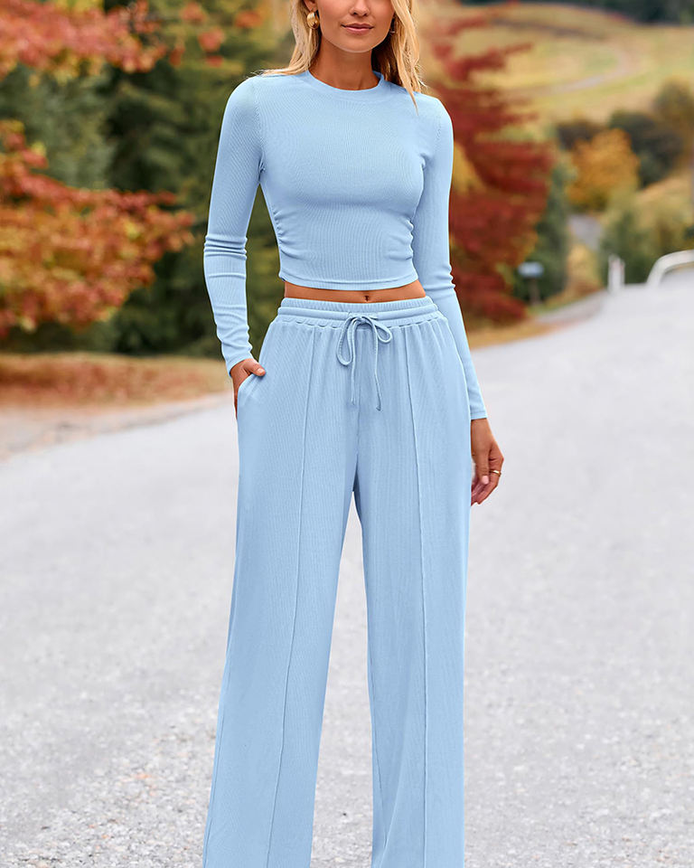 Conjunto de 2 Piezas de Color Sólido Minimalista para Mujer, Top Corto de Manga Larga + Pantalones Anchos de Cintura Alta, Traje Deportivo Informal de Corte Holgado