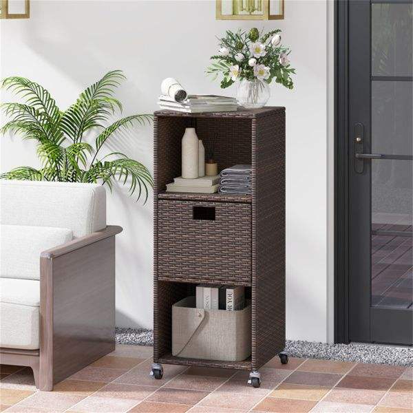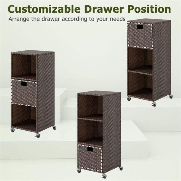 Armario de Almacenamiento Exterior de Mimbre Sintético Marrón con 3 Cajones Extraíbles y Ruedas con Bloqueo
