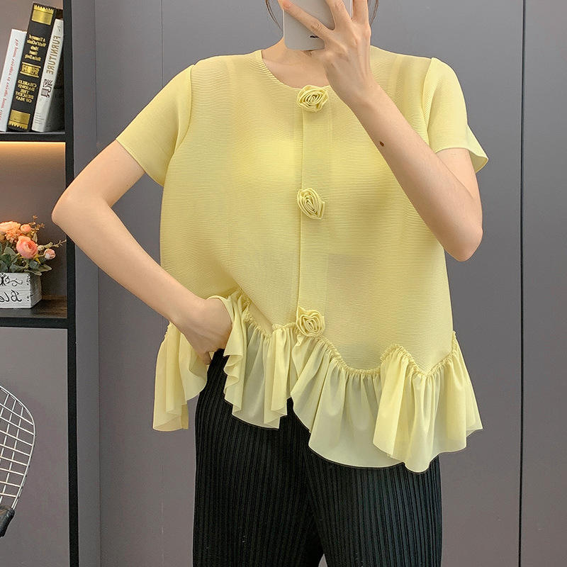 Miyake 2025, nuevo estilo, camiseta plisada, diseño de gama alta, moda Vintage, dulce, fresco, holgado, versátil, adelgazante, Top de manga corta