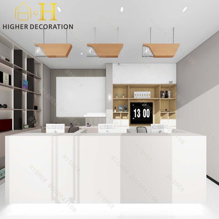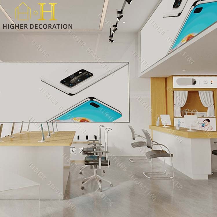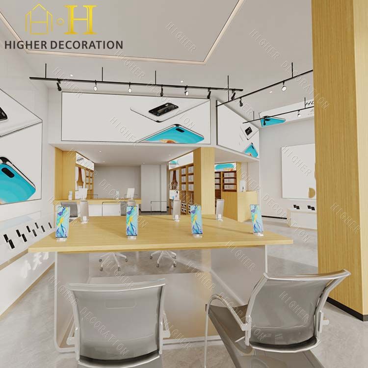 Diseño de tienda de teléfonos móviles, mesa de mostrador de exhibición de teléfono móvil de madera duradera personalizada para escaparate de teléfono móvil
