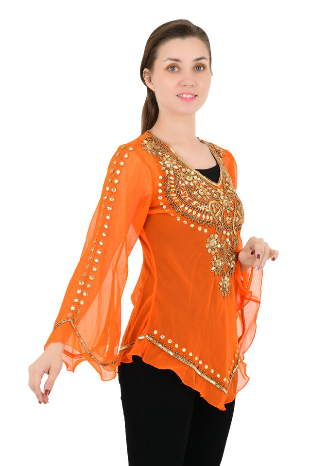 Moda Noua Stralucitoare Cu Paiete bordado y abalorios Georgette cuello en V Blusa de manga larga para mujer ropa de cóctel de verano
