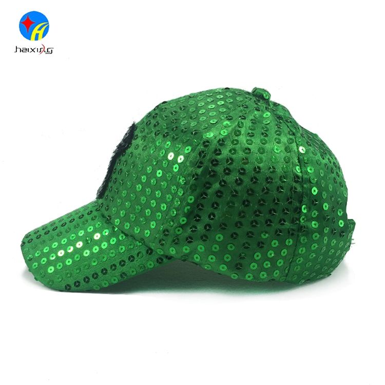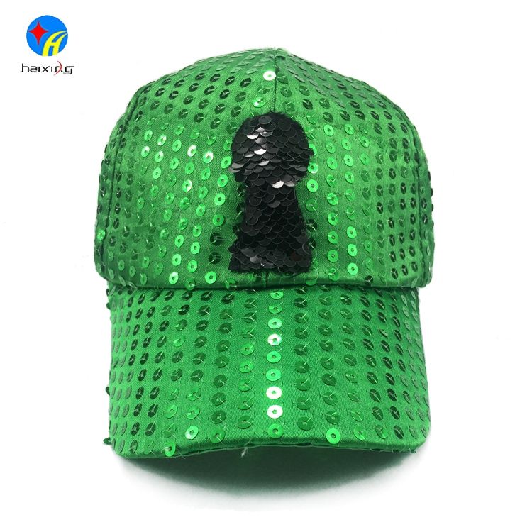 Moda al por mayor 6 panel llano verde lentejuelas gorra de béisbol