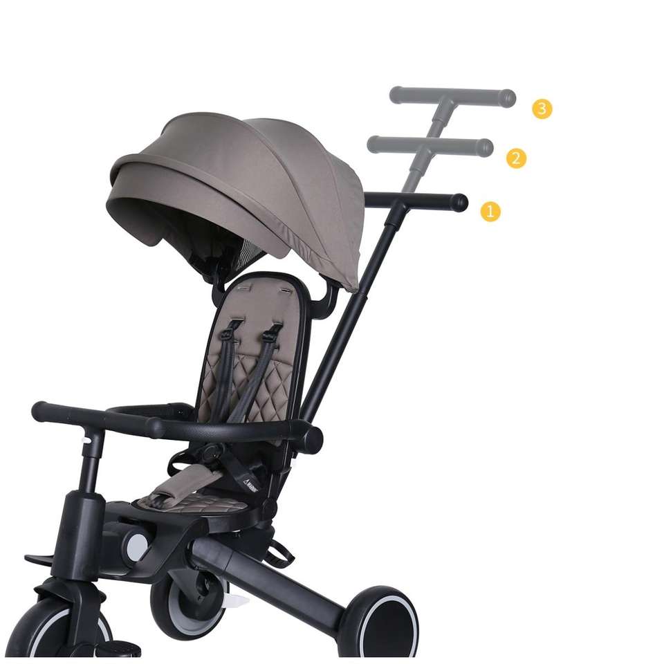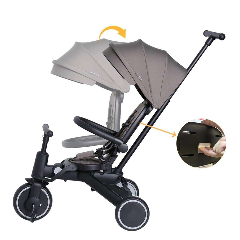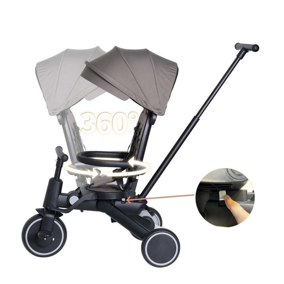 Triciclo para niños con freno enlazado de alta calidad de fábrica, triciclo para bebés de fácil plegado con respaldo tumbado y asiento giratorio para montar en coche