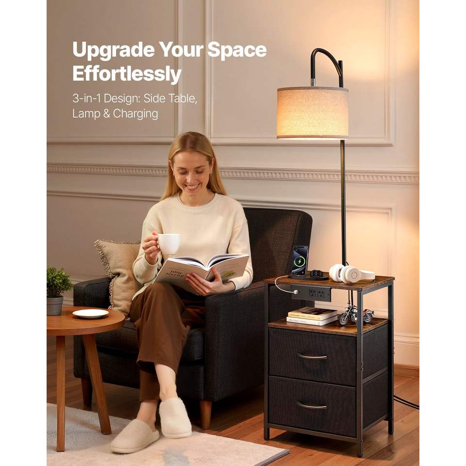 Mesa Auxiliar Moderna de 2 Niveles y 2 Cajones con Iluminación de 3 Temperaturas de Color, Mesita de Noche, Escritorio, Lámpara de Pie, Mesa Lateral Contemporánea