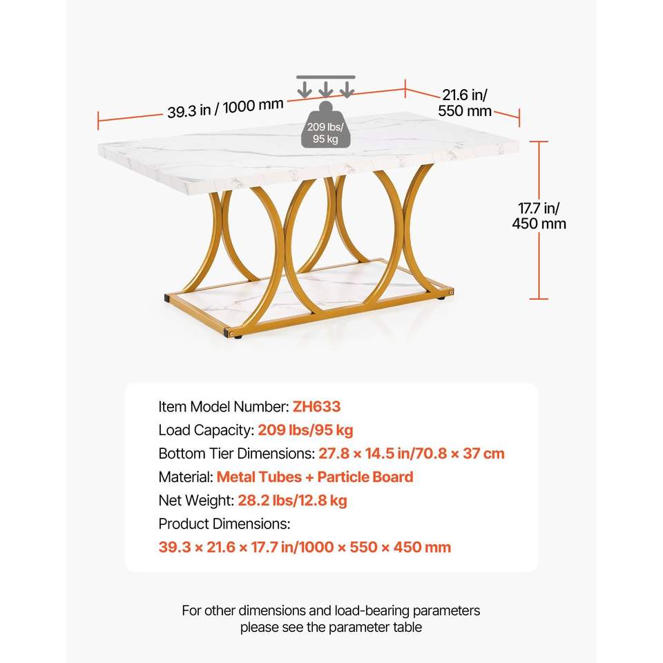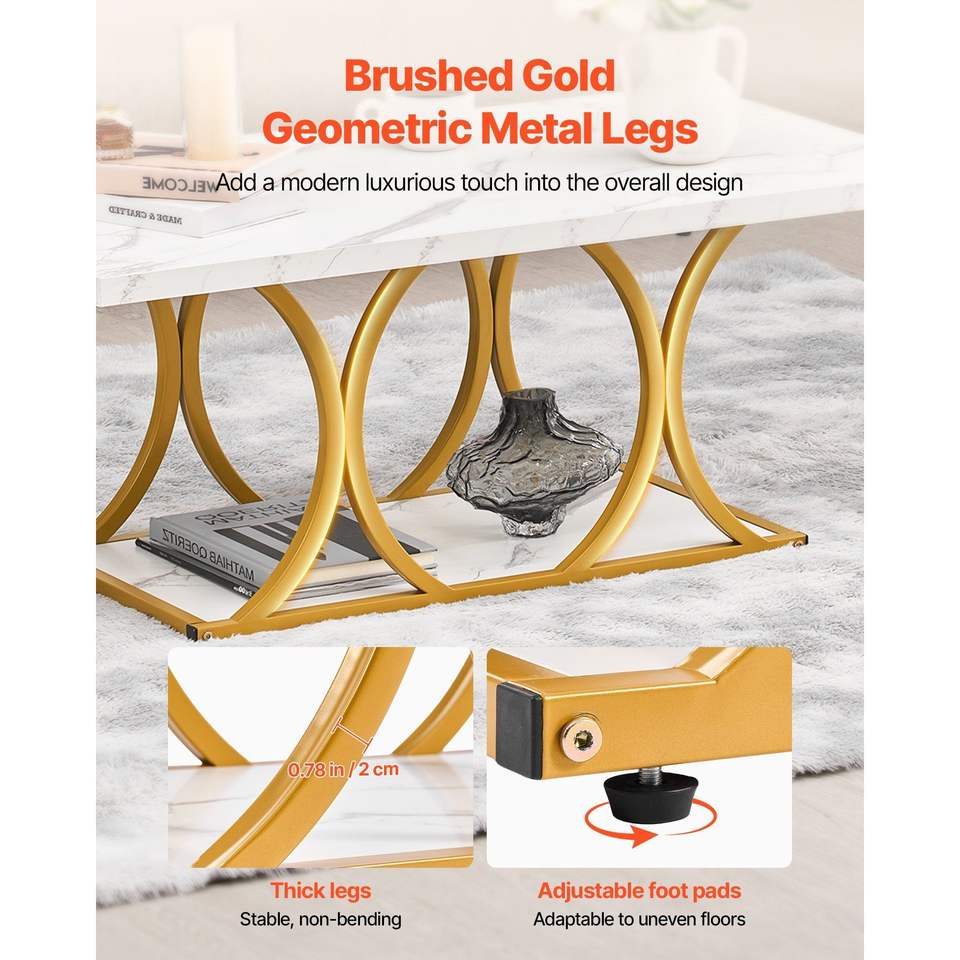 Mesa de Centro Moderna de 2 Niveles, Rectangular, con Aspecto de Mármol, Patas Metálicas Geométricas, Resistente y Minimalista, para Sala de Estar