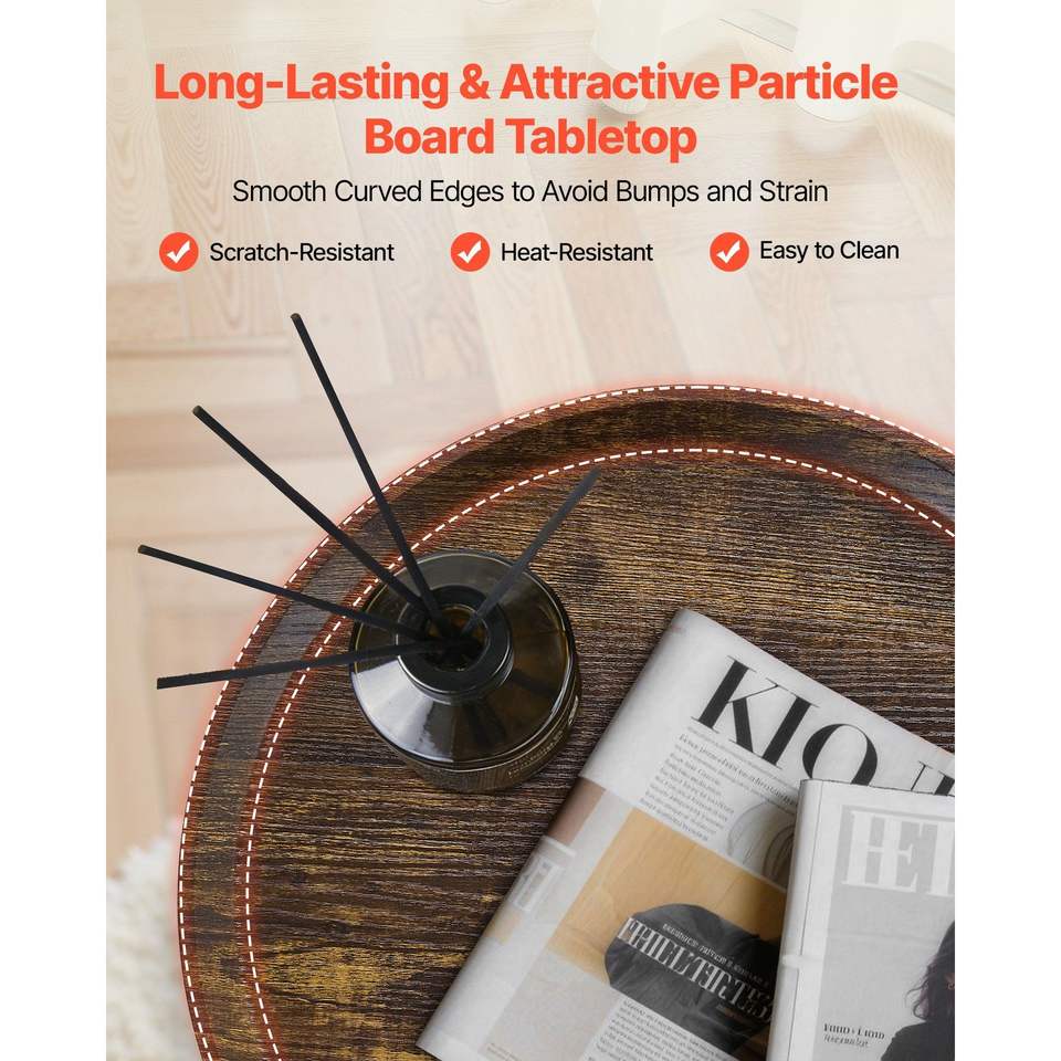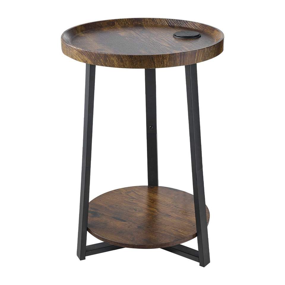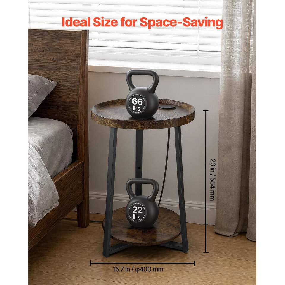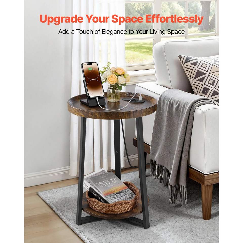 Mesa Auxiliar Redonda Moderna de 2 Niveles con Estantes Abiertos para Almacenamiento, Puerto de Carga USB y AC, Acabado en Madera, Mesa de Noche