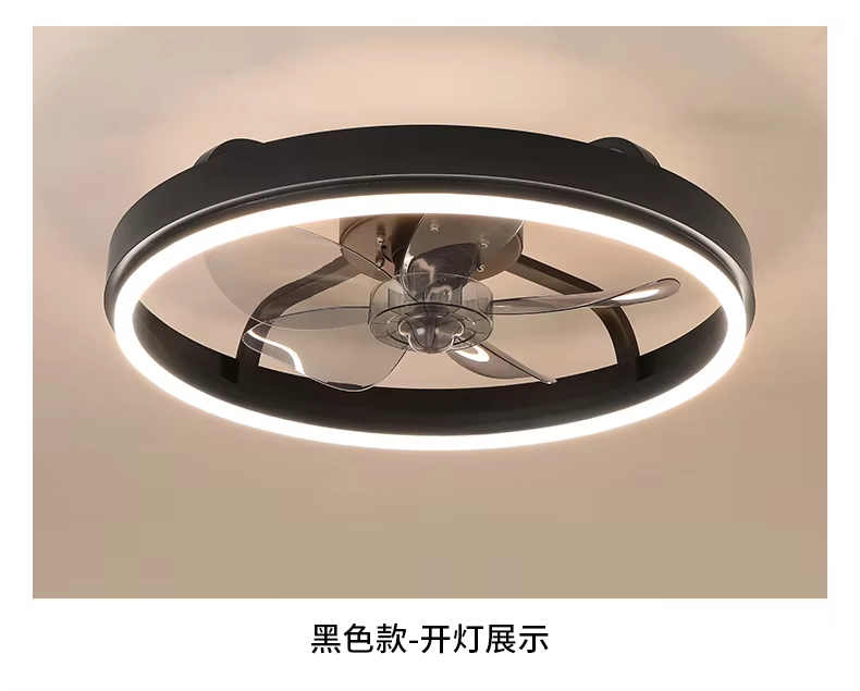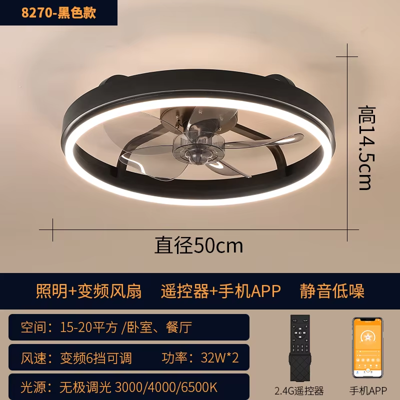 Modern 20-Inch 6-Speed Silent DC Motor Ceiling Fan LED Light Plastic Circular Black 5 Blades Infinite Dimming App Remote Control