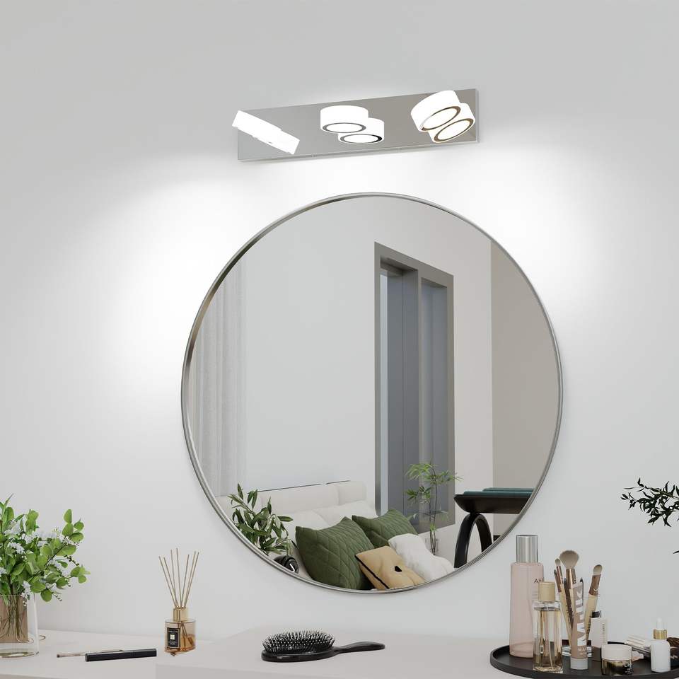 Lámpara de Vanidad LED Moderna de 21 Pulgadas, 3 Lentes Acrílicas Ovaladas Blancas, Base Cromada, Rotación de 360 Grados, Iluminación para Espejo de Baño