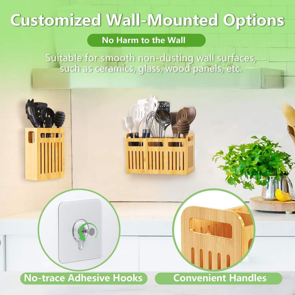 Moderno Organizador de Utensilios de Cocina de Bambú con 3 Compartimentos, Organizador de Encimera con Divisores Extraíbles para un Almacenamiento Eficiente