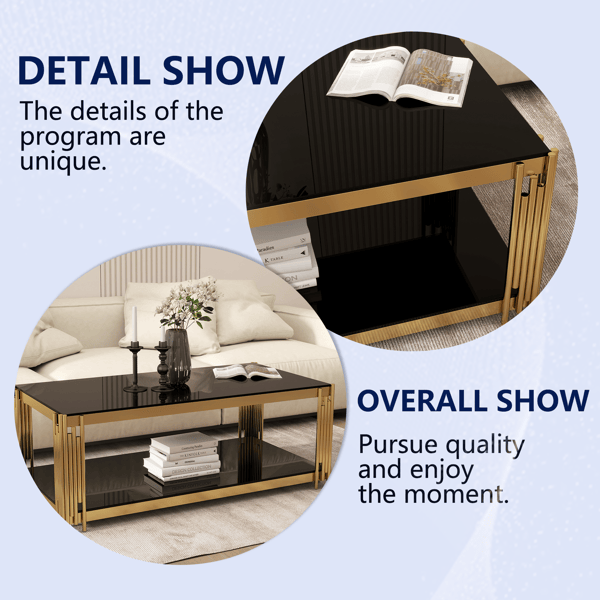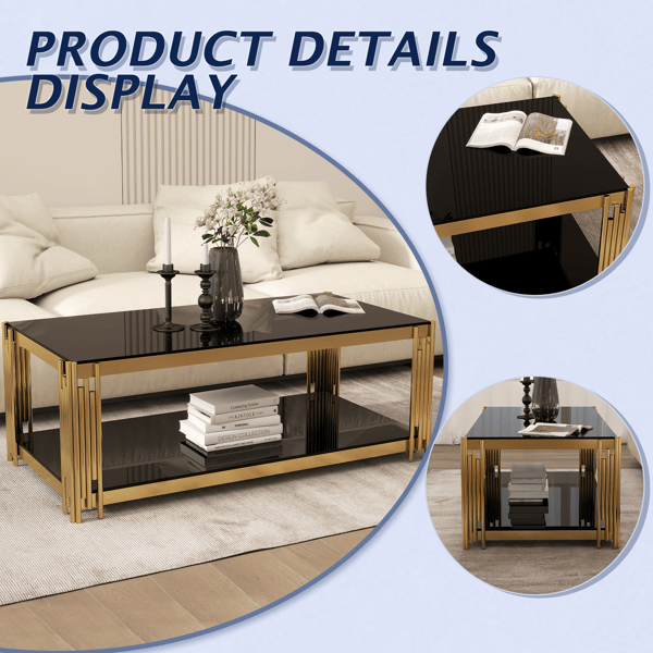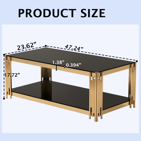 Mesa de Centro Moderna Rectangular de 47 Pulgadas con Doble Capa de Vidrio Dorado, Cubierta de Vidrio Templado Negro y Acabado de Acero Inoxidable para Sala de Estar