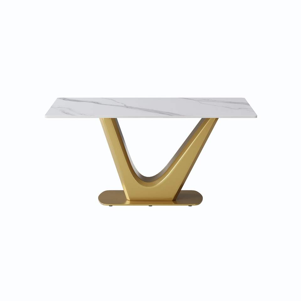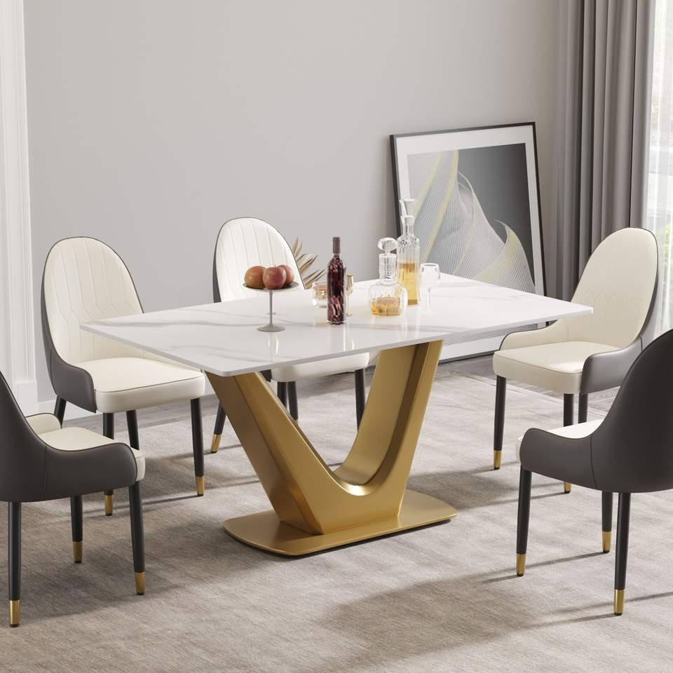 Mesa de comedor moderna de 63 "con patas de metal doradas en forma de V Panel de piedra artificial blanca con capacidad para 6-8 personas