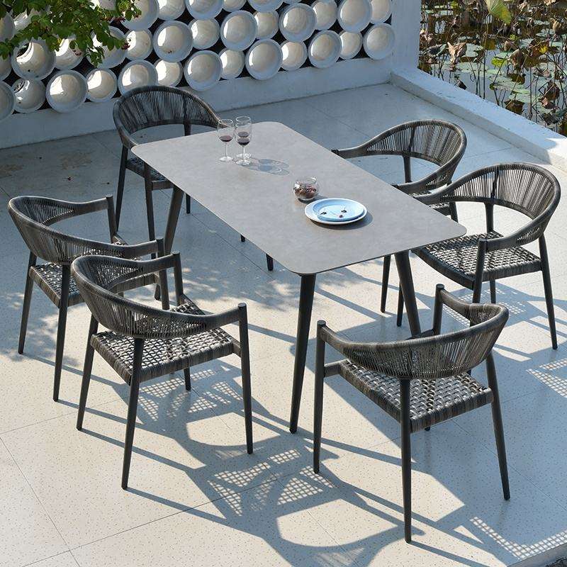 Moderno Juego de Comedor para Exterior de 7 Piezas con Mesa Rectangular, Sillas de Cuerda Tejida y Estructura de Aluminio Resistente a la Intemperie para Uso en Hoteles y Jardines