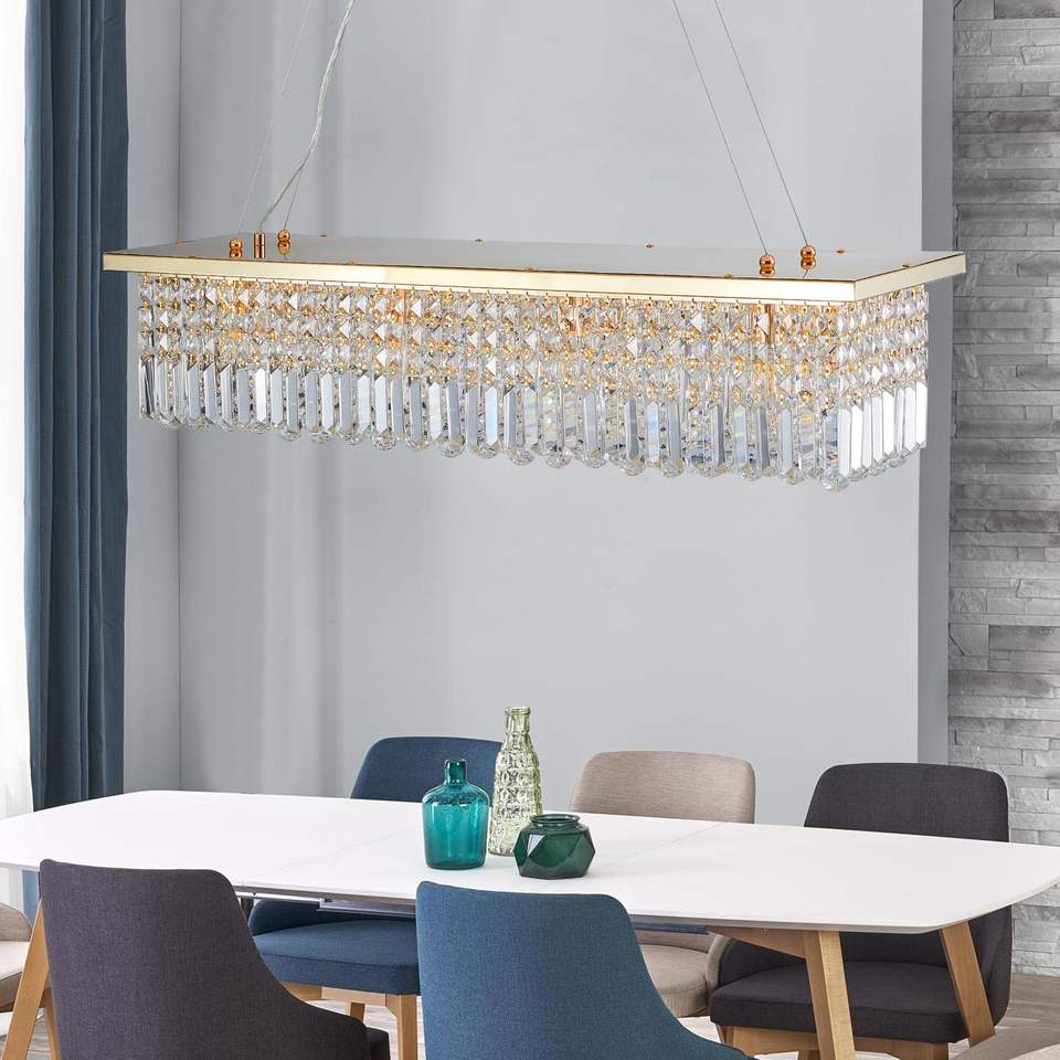 Lámpara de Araña Rectangular Moderna de Cristal con 8 Luces, Diseño de Gotas de Lluvia, Dorada, para Comedor, Estilo Contemporáneo