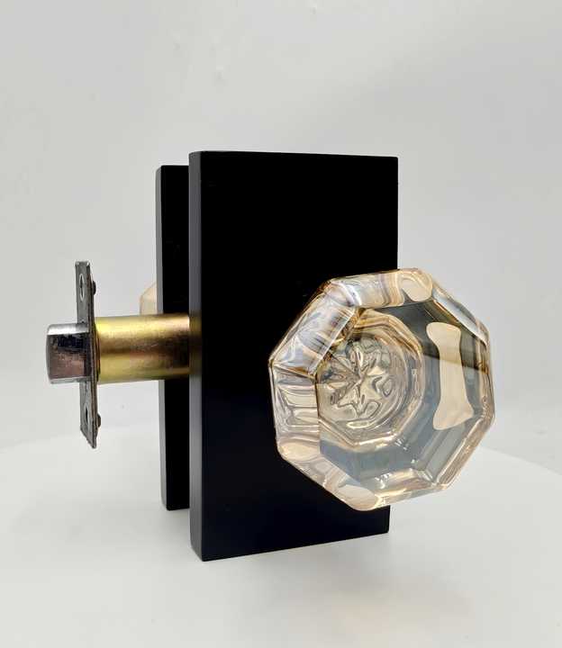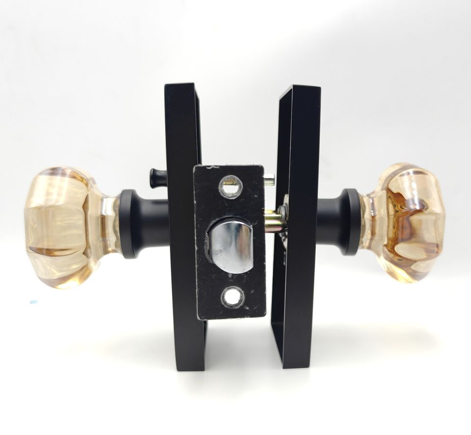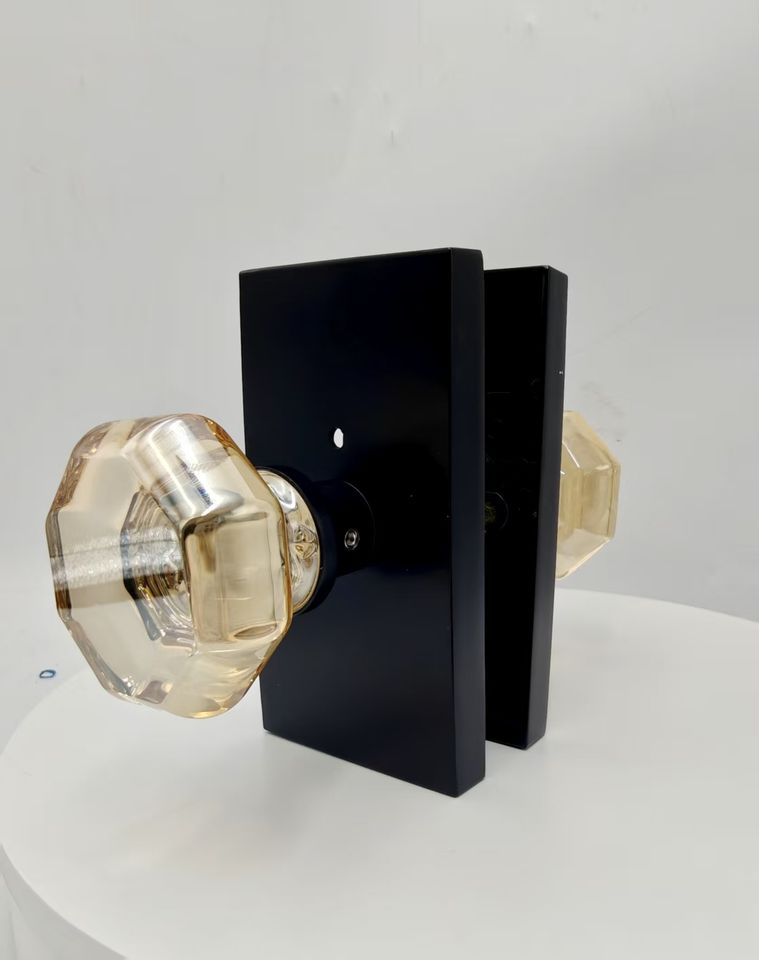 Manijas de Puerta Modernas de Cristal Octagonal Color Ámbar con Placa de Aleación de Zinc Negra para Privacidad en Interiores de Dormitorios