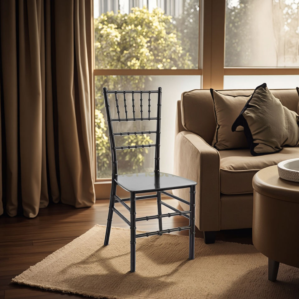 Silla de comedor apilable Chiavari de plástico negro moderno asientos coloridos para restaurantes cocinas cafeterías villas proveedor mayorista