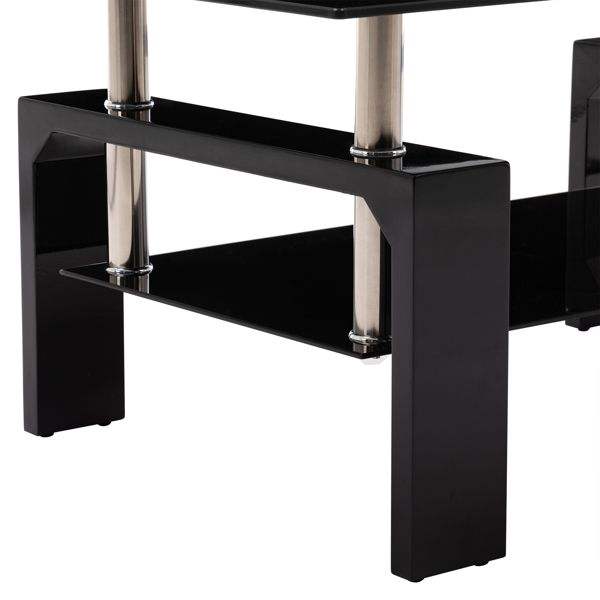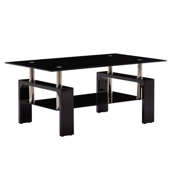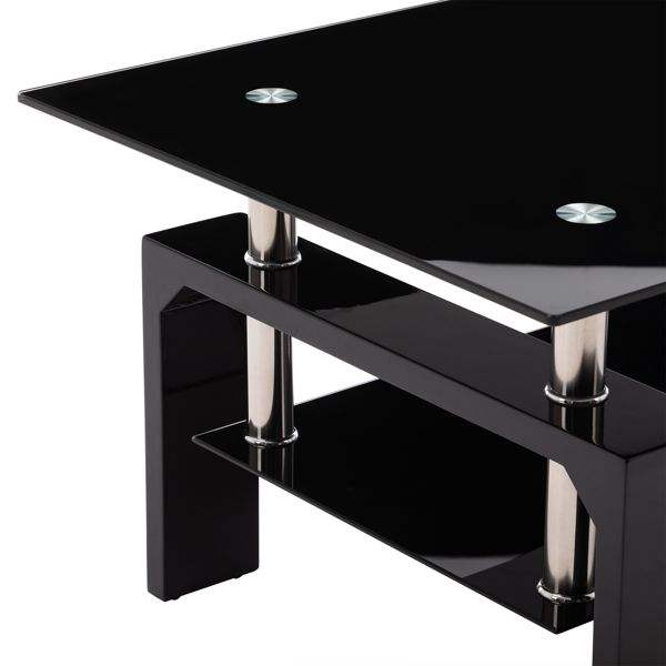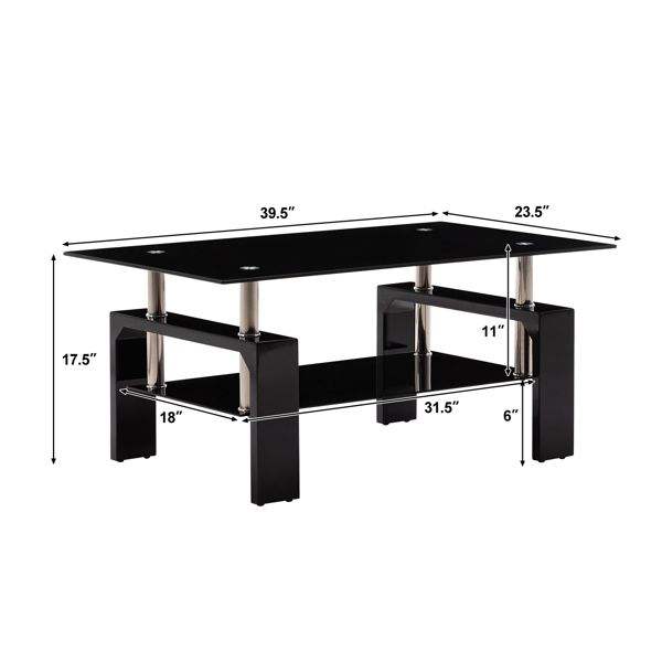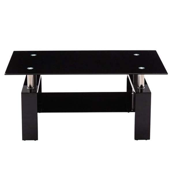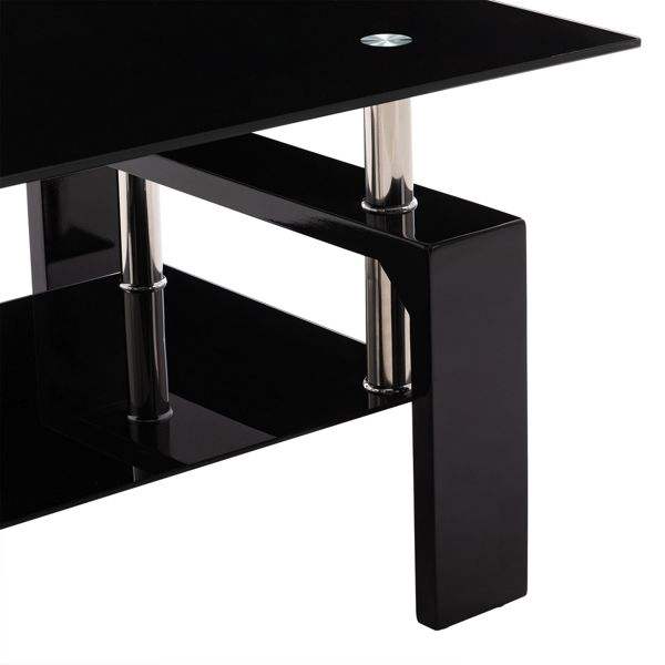 Modern Black Rectangle Coffee Table with Side Highlight Glass Top and Shelf for Living Room