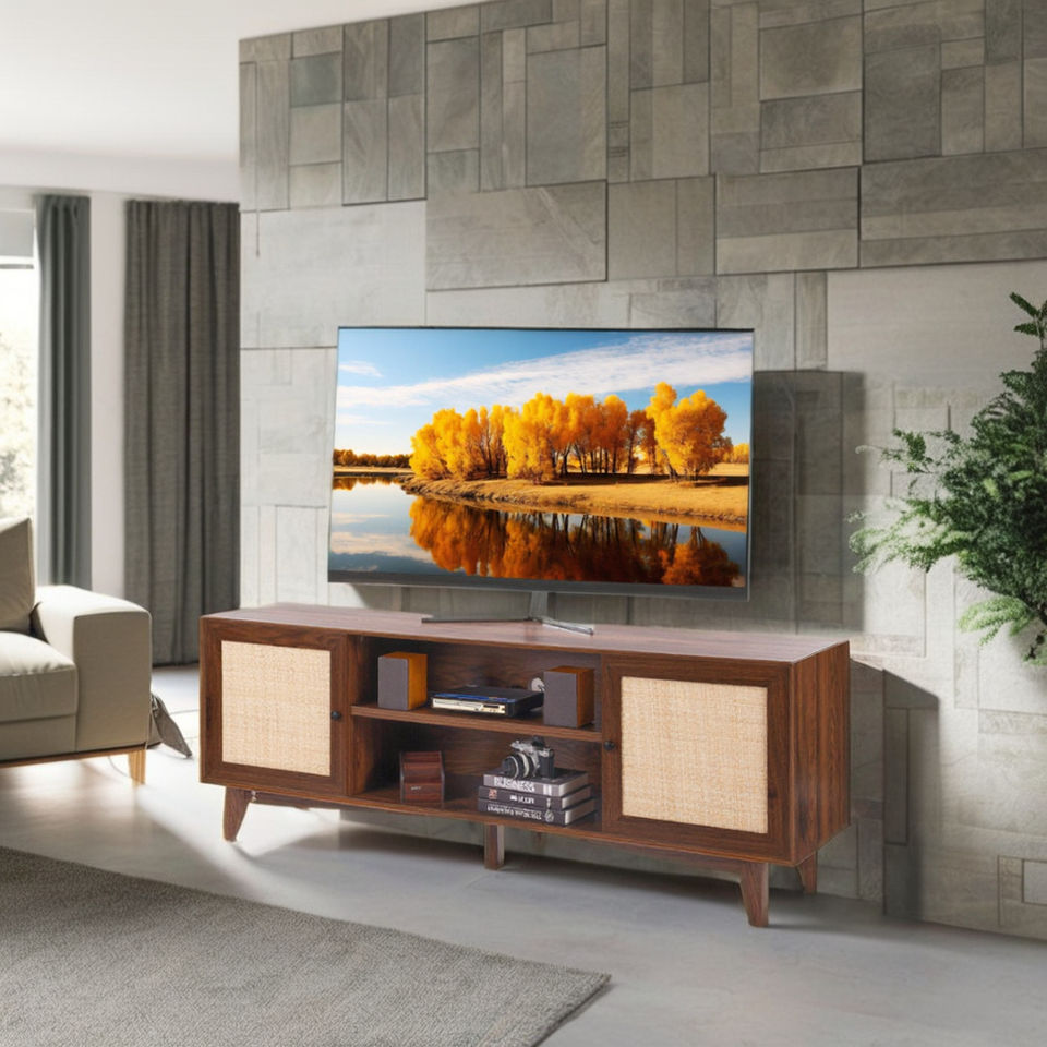 Moderno Mueble para TV de Ratán y Nogal Estilo Boho con Enchufe Integrado y Almacenamiento para Sala de Estar, Hotel y Apartamento, 65 Pulgadas o Más