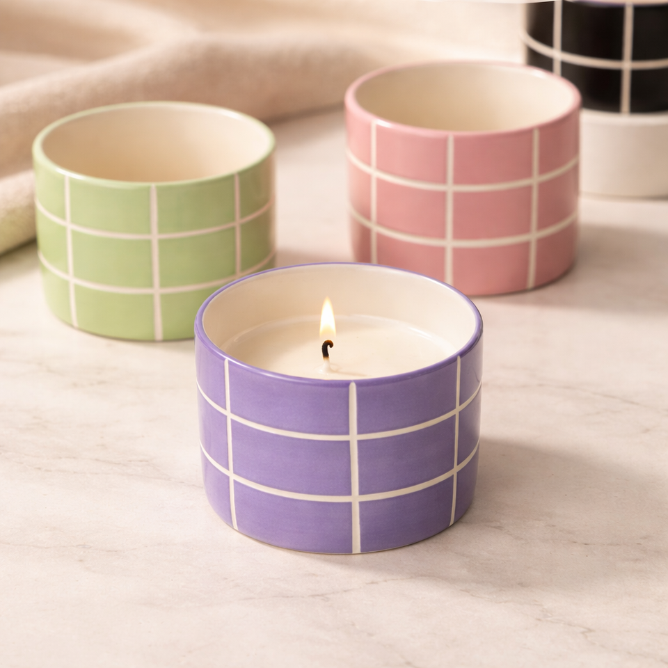 Moderno Portavelas de Cerámica con Diseño de Rejilla, Una Sola Mecha, Larga Duración, Acabado Mate, Decoración de Lujo para el Hogar