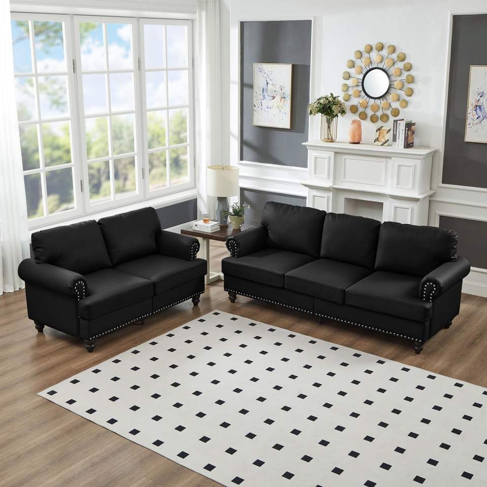 Sofá de dos plazas de 2 + 3 asientos de diseño clásico moderno sofá de piel de vaca de imitación negra para sala de estar