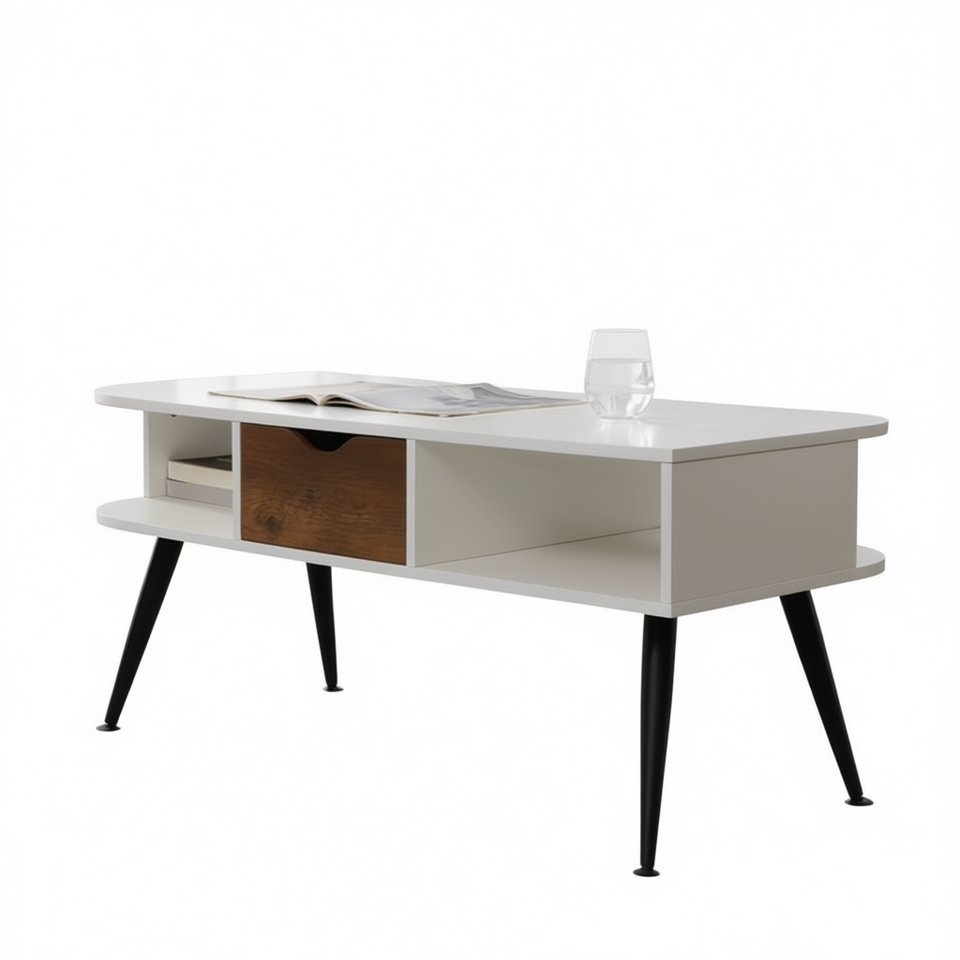Mesa de Centro Moderna con Almacenamiento, Superficie Laminada Blanca, Patas de Metal, Diseño de Mediados de Siglo, Muebles para Sala de Estar