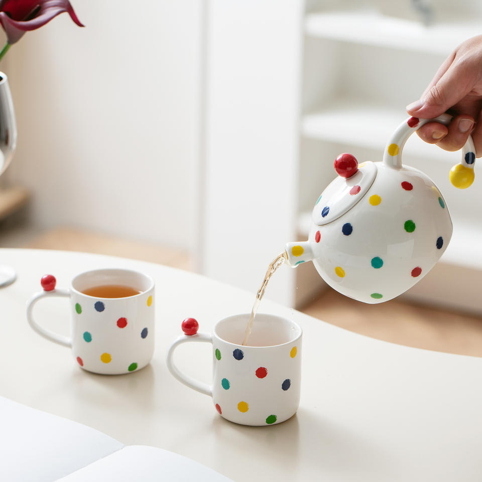 Juego de Té de Cerámica Moderno con Diseño de Puntos Coloridos, Una Tetera y Dos Tazas, Juego de Té de Porcelana