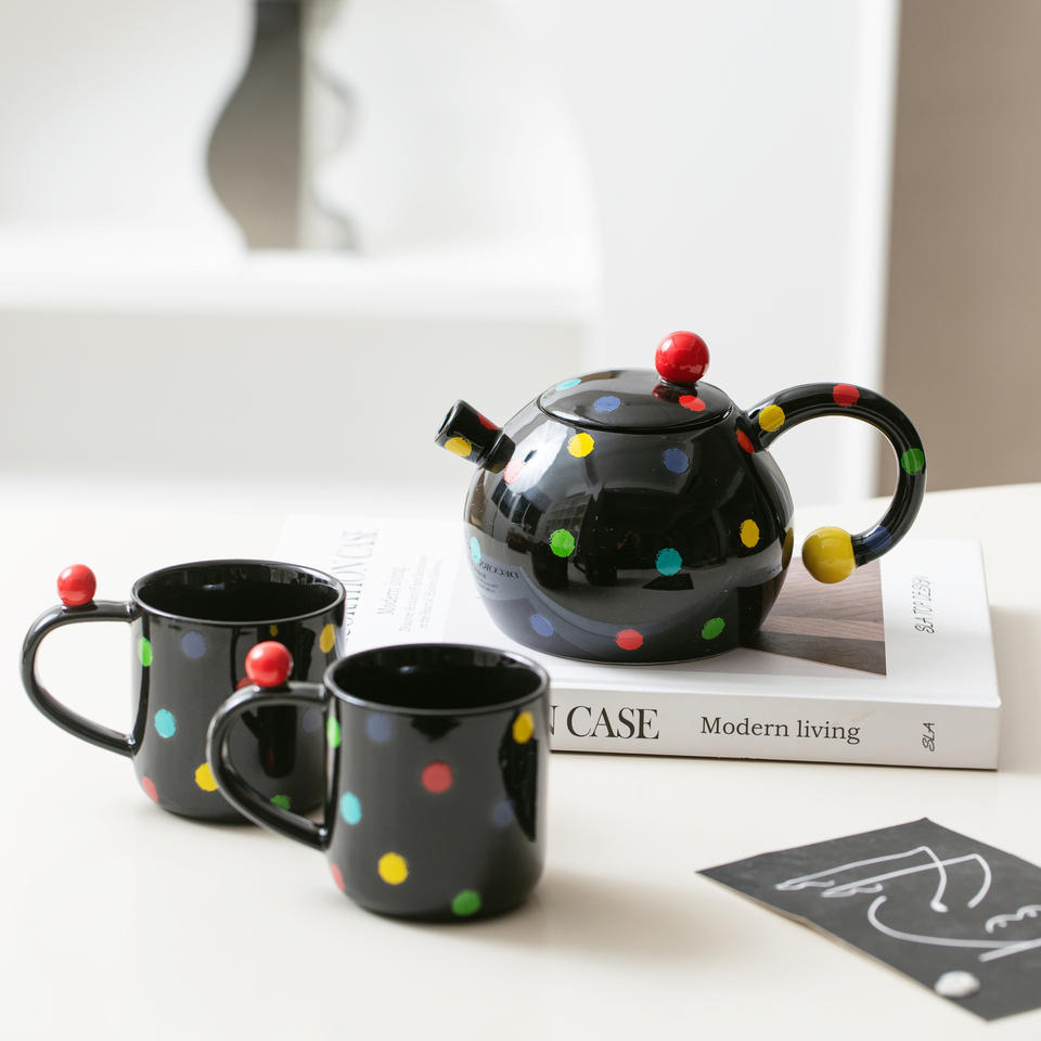Juego de té de cerámica moderno y colorido con lunares, una tetera y dos tazas