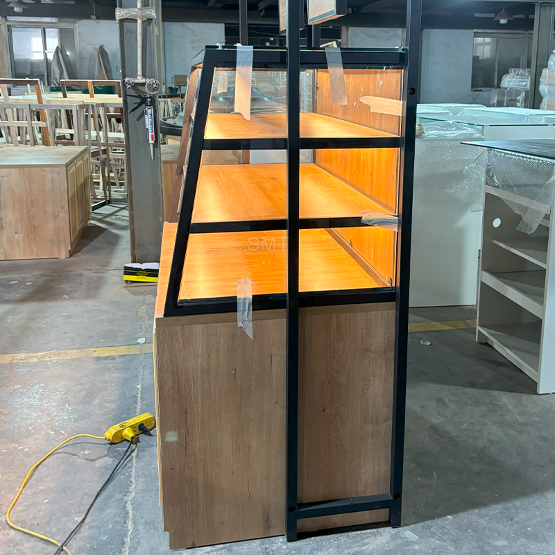 Mesa refrigerada de pastelería comercial moderna, escaparate de exhibición de pan, estante de tienda de panadería, vitrina de madera para supermercado