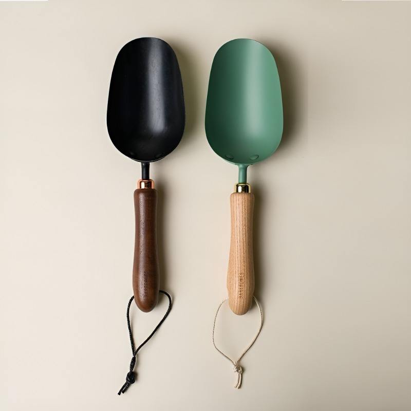 Juego de palas de jardín modernas y compactas de hierro con recubrimiento de polvo negro y mangos ergonómicos de madera para uso doméstico