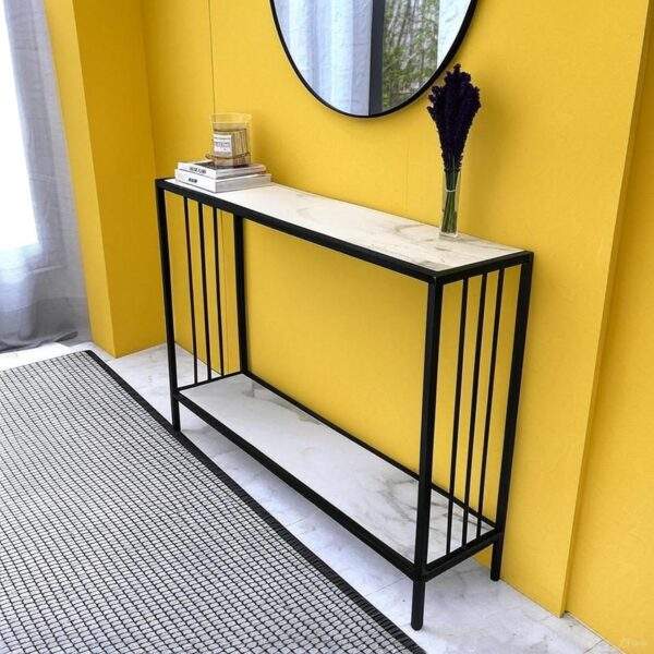 Mesa Consola Moderna Convertible con Acabado de Mármol y Estructura de Metal Negro para Sala de Estar y Uso en Hoteles