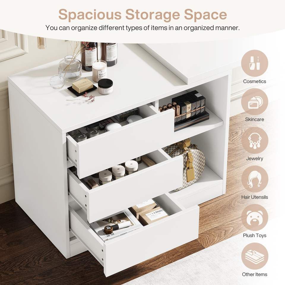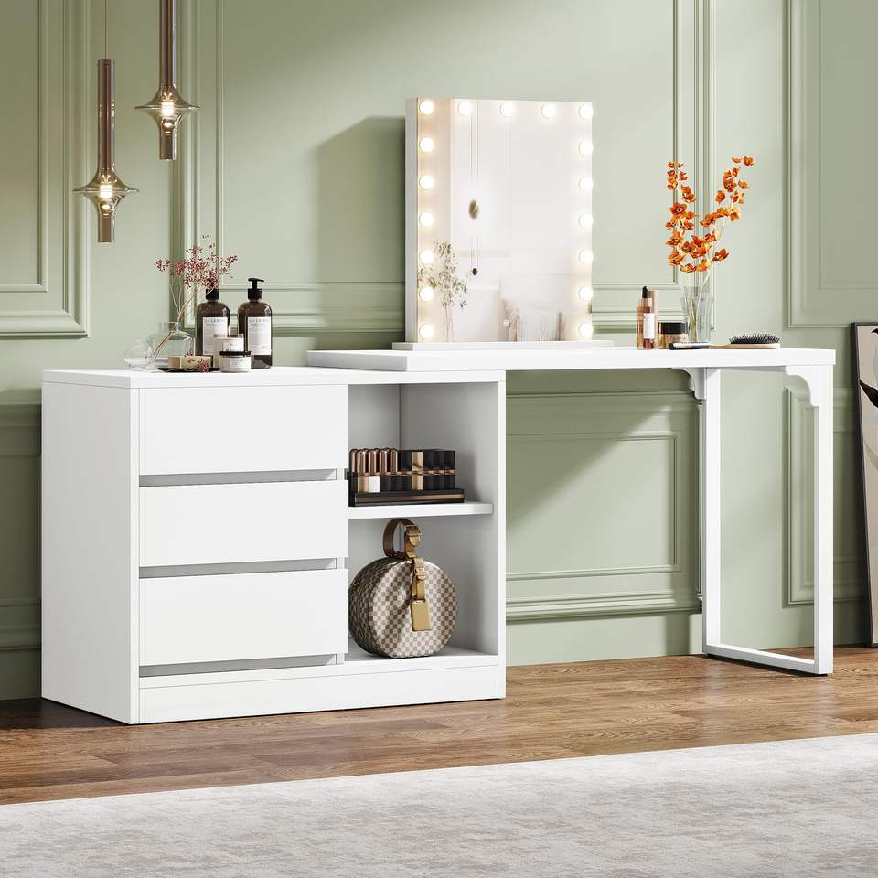 Mesa de Maquillaje Moderna de Esquina con 3 Cajones y 2 Estantes, Escritorio Compacto Blanco con Organizador Reversible