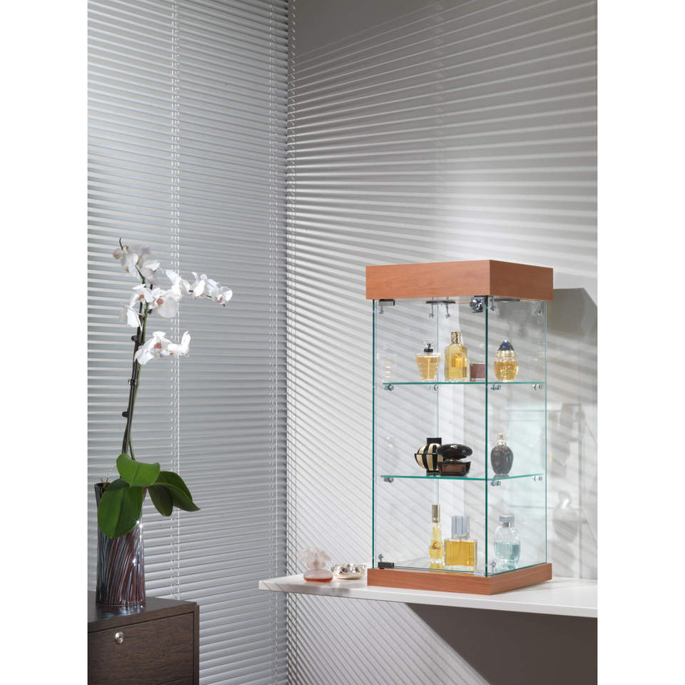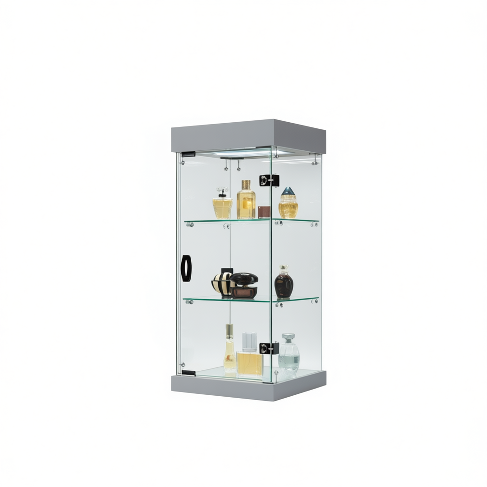 Vitrina Moderna de Mostrador con Vidrio Templado de 35 cm de Ancho, Puerta con Cerradura e Iluminación Halógena, Acabado Gris Claro