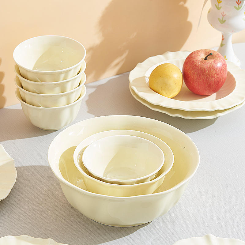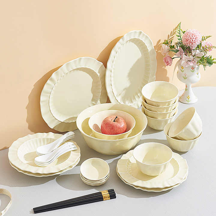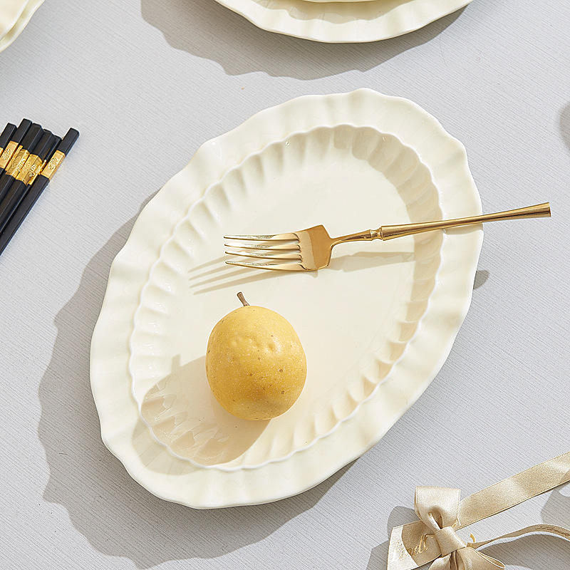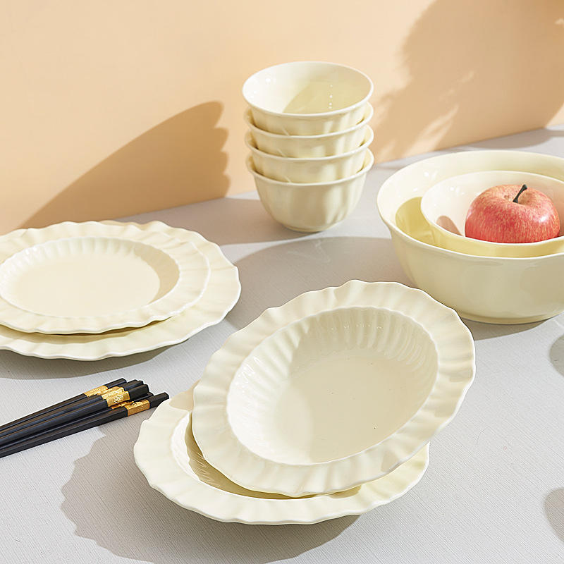 Juego de vajilla desechable de cerámica crema moderna con kit de utensilios cuencos de diseño de encaje para regalos de inauguración de la casa de frutas uso doméstico