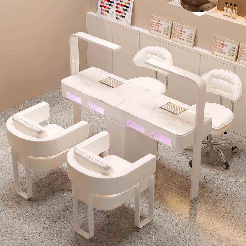 Juego de sillas de MESA DE MANICURA en crema moderna, aspiradora de alta potencia, lámpara para hornear con luz roja, mesa para uñas