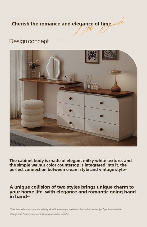 Tocador Moderno de Madera Maciza Color Crema con Espejo Iluminado y Almacenamiento Abatible, Mesita de Noche Simple de Estilo Retro para Dormitorio
