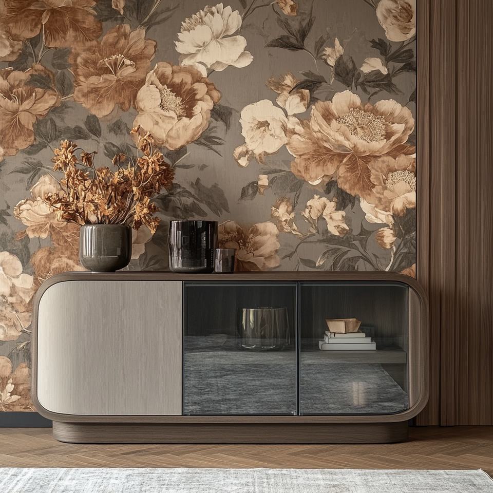Aparador Moderno con Laterales Curvos, Tapa de Madera y Centro de Exhibición de Vidrio, Credenza de Almacenamiento de 2 Puertas para Sala de Estar, Venta al por Mayor