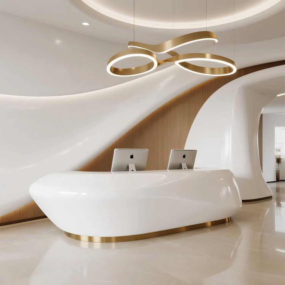 Mostrador de Recepción Moderno Curvo Amarillo con Recorte Ovalado para Uso en Vestíbulo de Oficina Comercial