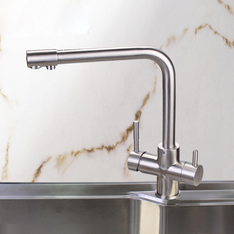 Grifo de Cocina Moderno de 3 Vías con Doble Manija, Mezclador de Acero Inoxidable con Rociador Extraíble, Acabado Dorado, Grifos para Lavabo de Baño