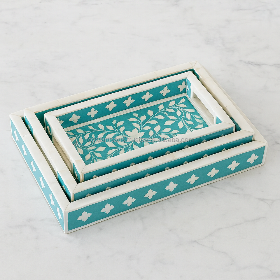 Bandeja de servicio de diseño floral con incrustaciones de hueso hechas a mano de diseño moderno para hoteles y restaurantes de Royal Artisans